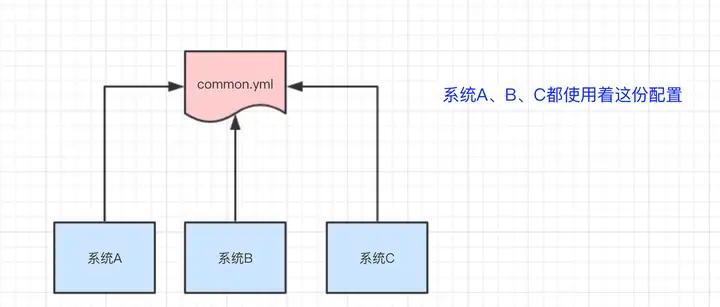 于是,我们希望把ASystem.yml、BSystem.yml、CSystem.yml相同的配置项抽取出来成一份公用的配置common.yml,并且即便common.yml改了,也不需要系统A、B、C重启。